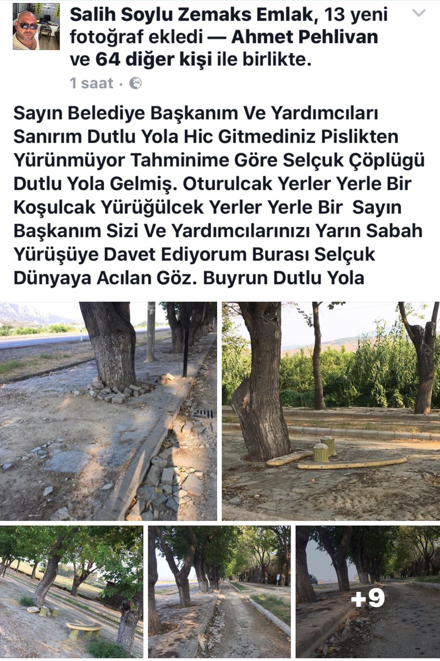 Selçuk'un ünlü alanlarından olan Dutlu Yol'un şantiyeye dönmesi ve uzun bir süredir burada yapılan çalışmaların yarım bırakılması her gün çok sayıda ziyaretçisi olan yeri ıssız bir alana çevirmiş durumda. Oturacak yerlerin yerle bir edilmesi, yürüyüş parkurunun kazılması ve etraftaki çöpler, ilçe vatandaşları tarafından tepkiyle karşılandı. Selçuk Belediyesi ve Başkan Dahi Zeynel Bakıcı'ya tepkilerini dile getiren bir vatandaş, "Dutlu Yol pislikten yürünmeyecek hale geldi. Tahminimce Selçuk'un çöplük alanı buraya taşındı. Oturulacak yerler yerle bir, yürünecek yerler yerle bir... Sayın Başkan ve yardımcılarını burada bir sabah yürüyüşüne davet ediyorum. Bakalım kendisi bu manzara karşısında neler düşünecek" açıklamasında bulundu.