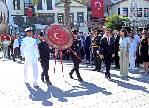 Cumhuriyet Meydanı'ndaki resmi törene, ilçe protokolü, kurum ve kuruluş temsilcileri, Belediye Meclis Üyeleri, siyasi parti, sivil toplum kuruluşları ve oda temsilcileri, gaziler, şehit yakınları ve çok sayıda vatandaş katıldı.