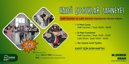 Çocuklar için Halk Oyunları ve Latin Dansları kursu düzenleyen Çeşme Belediyesi'nde kayıtlar devam ediyor.
