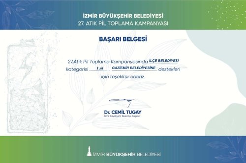 Gaziemir Belediyesi, İzmir Büyükşehir Belediyesi’nin düzenlediği 27. Atık Pil Toplama Kampanyası’nda, İlçe Belediyeleri kategorisinde 1. oldu.