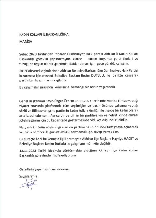 Değerli yol arkadaşlarım, hiç bir makam mevki beklentim olmamak kaydıyla, büyük bir sevgiyle özveri ve emekle yıllarca çalıştığım CHP Akhisar Kadın Kolları Başkanlığı'ndan Genel Başkanımız Özgür Özel'in Manisa ziyaretinde Belediye Başkanımızın bana gösterdiği tepkiden dolayı ve ilçe Başkanı Hayriye Hanımın bizlere uyguladığı mobbinglerinden ve ailemin de bu olayları öğrenmesinden dolayı ailemle almış olduğumuz karar doğrultusunda çok sevdiğim emek verdiğim Kadın Kolları Başkanlığımdan 13.11.2023 itibariyle istifa etmiş bulunmaktayım.