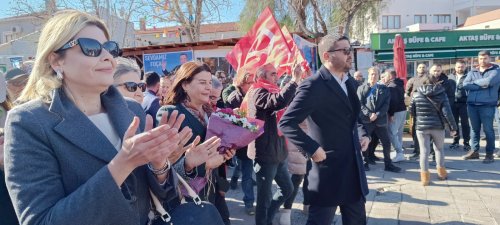 CHP Foça Belediye Başkan Adayı Saniye Bora Fıçı, miting gibi bir törenle karşılandı.