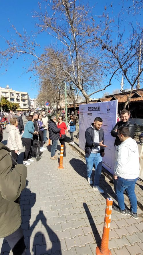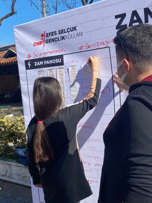 İzmir'in Selçuk ilçesinde vatandaşlar zamları CHP Selçuk Gençlik Kolları tarafından kurulan “Zam Duvarı’nda” protesto etti.