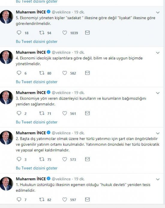 İnce resmi Twitter hesabından yaptığı açıklamada, ‘Hukukun üstünlüğü ilkesinin egemen olduğu “hukuk devleti” yeniden tesis edilmelidir. Başta dış yatırımcılar olmak üzere her türlü yatırımcı için şart olan öngörülebilir ve güvenilir yatırım ortamı kurulmalıdır. Yatırımcının önündeki her türlü bürokratik ve yapısal engel kaldırılmalıdır. Ekonomiye yön veren düzenleyici kurulların ve kurumların bağımsızlığını yeniden sağlanmalıdır.Ekonomi ideolojik saplantılara göre değil, bilim ve akla uygun biçimde yönetilmelidir. Ekonomiyi yöneten kişiler ”sadakat “ ilkesine göre değil “liyakat” ilkesine göre görevlendirilmelidir. Kaynaklar, israf ve talan ekonomisine değil, üretim ekonomisine yönlendirilmelidir’ dedi.