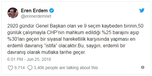 CHP yönetimini istifaya çağıran diğer bir isim de Eren Erdem oldu. Erdem, twitter hesabından yaptığı açıklamada, parti yönetimini istifaya çağırarak, "%30’ları geçen bir siyasal hareketlilik karşısında yapması en erdemli davranış “istifa” olacaktır" dedi.