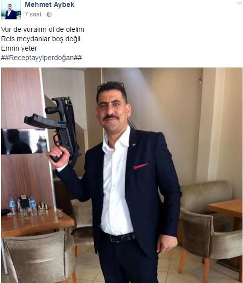 Aynı zamanda erkek kuaförü olan Mehmet Aybek, CHP Milletvekili Enis Berberoğlu´nun tutuklanması üzerine CHP’nin Ankara’dan İstanbul’a ‘Adalet Yürüyüşü’ başlatma kararı almasından sonra MP5 makineli tabanca ile çektirdiği fotoğrafı sosyal paylaşım sitesi Facebook hesabında paylaştı. AK Parti Gençlik Kolları Yönetim Kurulu üyesi Aybek’in, fotoğraf ile birlikte, “Vur de vuralım, öl de ölelim. Reis meydanlar boş değil, emrin yeter” notunu yazması dikkat çekti. Aybek, yaklaşık 6 saat sonra bu fotoğrafı sayfasından kaldırdı.