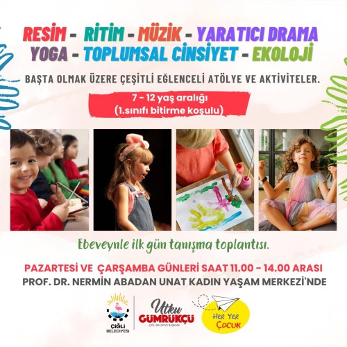 MEDYA EGE - Çiğli Belediyesi, 1. sınıfı bitirme koşulu ile 7-12 yaş arası çocuklara yönelik etkinlikler düzenliyor. Resim, ritim, müzik, yaratıcı drama, yoga, toplumsal cinsiyet ve ekoloji başta olmak üzere çeşitli eğlenceli atölye ve aktivitelerin yer alacağı etkinlikte ebeveynle ilk gün tanışma toplantısı düzenlenecek.
