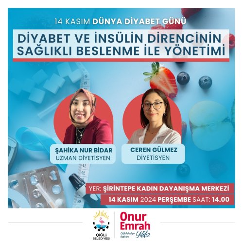 Çiğli Belediyesi Dünya Diyabet Günü kapsamında diyabet ve insülin direncine yönelik farkındalığı artırmak amacıyla "Diyabet ve insülin direncinin sağlıklı beslenme ile yönetimi" semineri düzenleyecek.