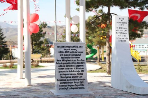 Açılış töreninde konuşan Cumhuriyet Halk Partisi Malatya Milletvekili ve Genel Başkan Yardımcıları Veli Ağbaba, “Gösterdikleri duyarlılıktan ötürü İzmir’imizin genç, partisine ve gençlerine bağlı Çiğli Belediye Başkanımız ile Kartal Belediye Başkanımız başta olmak üzere Çiğli İlçe Başkanımız Mert Özcan, Hüseyin Çetin ve İbrahim İncesu’ya teşekkür ediyorum. Bu parkı intikam duygusuyla değil yaşadığımız acıyı unutmamak için yaptık. 6 yıl önce Ankara’nın göbeğinde barış isteyen 104 insanımızı kaybettiğimiz büyük bir barbarlıkla karşılaştık. Bu saldırı, ülkemizin yaşadığı en büyük acı ve ayıplardan bir tanesi. Birilerinin siyasi geleceğini garanti altına almak için gerçekleşen bu katliamları ve acıları unutmayacağız. Bizim amacımız ülkeye; barışı ve kardeşliği getirmek. Siyasi kimliği, etnik yapısı ne olursa olsun bu toprağın hamurunda kardeşlik var o nedenle de bunu iktidara geldiğimizde başaracağız. Hekimhan’da dilin, dinin, etnik yapının, önemi yok. Tek değere bağlıdır Hekimhan, o da Atatürk ve burası ayrımcılığı bilmeyen bir ilçe. Umarım bu birliktelik tüm Türkiye’ye örnek olur. Biz parti tarihimizin en büyük katliamını yaşadık, ailelerimiz de büyük acı çekti ve çekmeye devam ediyor. Kardeşlerimizin amaçladığı barış ve sevgi, onların adı ile Hekimhan'da yaşayacak” sözleri ile konuşmasını sonlandırdı.