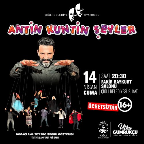 Çiğli Belediyesi, sosyal medya hesabından yaptığı paylaşımla 'Antin Kuntin Şeyler' adlı tiyatro oyununun gösterime gireceğini duyurdu. Yönetmenliğini Şahverdi Ali Eren'in üstlendiği doğaçlama tiyatro sporu gösterisi, 14 Nisan tarihinde saat 20.30'da yapılacak. Çiğli Belediyesi Fakir Baykurt Salonu'nda gösterilecek olan oyun ücretsiz olacak.