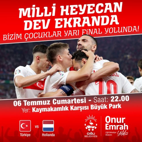EURO 2024 F Grubu'ndan çıkan ve son 16 turunda turnuvanın flaş takımı Avusturya'yı eleyerek Çeyrek Finale yükselen A Milli Futbol Takımımız, 6 Temmuz Cumartesi günü Hollanda ile karşı karşıya gelecek. Çiğli Belediyesi, Kaymakamlık karşısındaki Büyük Park'ta kuracağı dev ekran ile milli maç coşkusunu sporseverler ile buluşturacak. Saat 22.00'de başlayacak maçı Çiğlililer dev ekranda tek yürek olarak izleyecek.