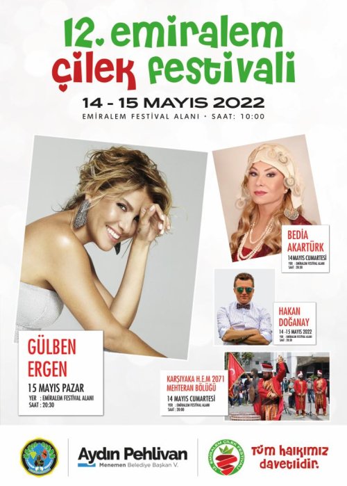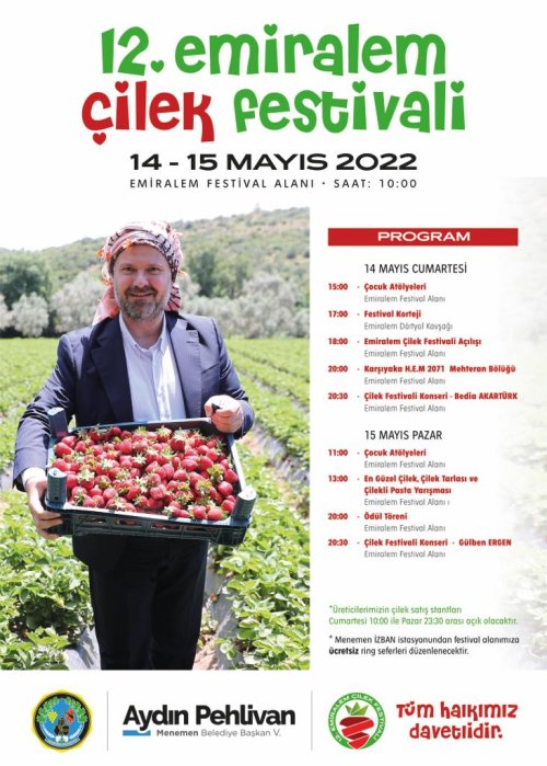 “Çilek tadında Festival” sloganıyla düzenlenecek olan ve geniş katılım beklenen festivale çilek hasatı eşliğinde vatandaşları davet eden Menemen Belediye Başkan Vekili Aydın Pehlivan, “Üretici ve tüketiciyi direkt buluşturacağımız festivalimiz için yoğun bir program hazırladık. Ünlü sanatçılarımız Bedia Akartürk ve Gülben Ergen konserleriyle de akşamları hep beraber olacağız. Tüm hemşehrilerimizi Menemen’deki birbirinden renkli görüntülerin ve yarışmaların olacağı Emiralem Festivalimize davet ediyoruz” dedi.
