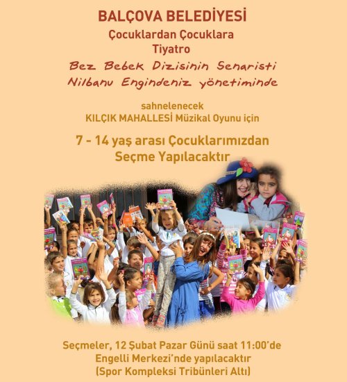 Nilbanu Engindeniz'in yönetiminde sahnelenecek Kılçık Mahallesi müzikal oyunu için 7-14 yaş arası çocukları seçmelere beklediğini duyuran Balçova Belediye Başkanı Fatma Çalkaya, seçmelerin 12 Şubat Pazar günü gerçekleşeceğini belirtti.