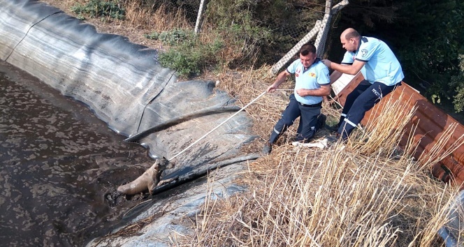 Hayvan atık çukuruna düşen köpekler kurtarıldı