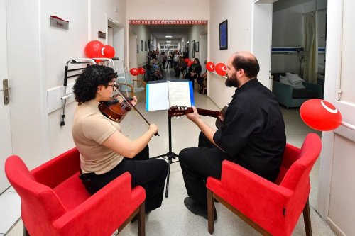 Eşinin hastalığından dolayı Eşrefpaşa Hastanesi Palyatif Servis’te kaldıklarını ve müzik seslerini duyunca şaşırdığını dile getiren Vahide Uğurlu, “Tüm koridorlar bayraklarla donatıldı. 100. yılda meydanlarda olamayacağız belki ama hastanemizde bu duyguyu tattık. Çok gururlandık” dedi.