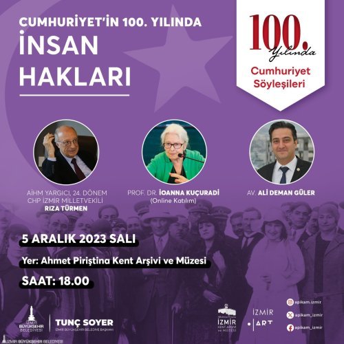 İzmir Büyükşehir Belediyesi Kent Arşivi, Müzeler ve Kütüphaneler Şube Müdürlüğü tarafından düzenlenen Cumhuriyet Söyleşilerinin üçüncüsü “Cumhuriyetin 100. Yılında İnsan Hakları” başlığı ile devam ediyor.