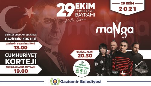 Kortej yürüyüşünün ardından bayram coşkusu Manga konseriyle zirveye ulaşacak. Festival Alanı’nda saat 20.30’da sahne alacak Manga grubu, marşları ve şarkılarını Cumhuriyet için seslendirecek.