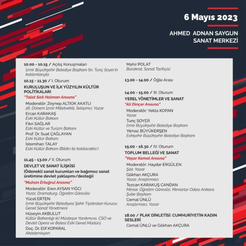 MEDYA EGE - İzmir Büyükşehir Belediyesi’nin düzenlediği Cumhuriyet’in II. Yüzyılı Kültür ve Sanatın Sempozyumu, Ahmet Adnan Saygun Sanat Merkezinde 06 – 07 Mayıs tarihlerinde gerçekleştirilecek.