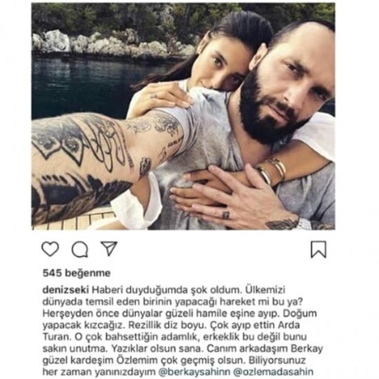 Ünlü şarkıcı Deniz Seki Arda Turan’a büyük tepki göstererek, “Haberi duyduğumda şok oldum. Ülkemizi dünyada temsil eden birinin yapacağı bir hareket mi bu ya? Her şeyden önce dünyalar güzeli hamile eşine ayıp. Doğum yapacak kızcağız. Rezillik diz boyu. Çok ayıp ettin Arda Turan. O çok bahsettiğin adamlık, erkeklik bu değil bunu sakın unutma. Yazıklar olsun sana. Canım Arkadaşım Berkay güzel kardeşim Özlemim çok geçmiş olsun. Biliyorsunuz her zaman yanınızdayım” yorumunu yaptı.