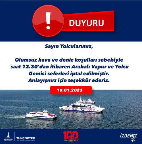 İZDENİZ tarafından yapılan açıklamada, olumsuz hava ve deniz koşulları nedeniyle vapur ve feribot seferlerinin iptal edildiği belirtildi.