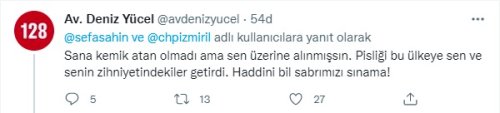 Yücel’den AKP’li Şahin’e ise sert tepki geldi. Yücel, AKP’li Şahin’e yanıt olarak; “Sana kemik atan olmadı ama sen üzerine alınmışsın. Pisliği bu ülkeye sen ve senin zihniyetindekiler getirdi. Haddini bil sabrımızı sınama!” ifadelerini kullandı.