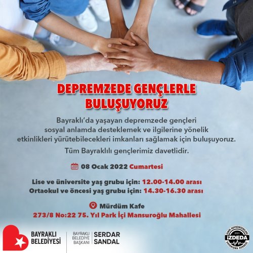 Medya Ege- Bayraklı Belediyesi, depremzede gençleri sosyal anlamda desteklemek ve ilgi alanlarına yönelebilecekleri imkanları sağlamak amacıyla "Depremzede gençlerle buluşuyoruz" etkinliği düzenliyor. Bayraklı Mürdüm Park'ta 8 Ocak Cumartesi günü gerçekleşecek olan etkinlik, yaş gruplarına göre iki oturum halinde yapılacak. Lise ve üniversite yaş grubu oturumu 12.00-14.00 saatleri arasında, ortaokul ve öncesi yaş grubu oturumu ise 14.30-16.30 saatleri arasında gerçekleşecek.