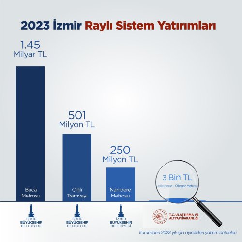 Ardından konuya ilişkin bir açıklama yapan Başkan Soyer, İzmir Büyükşehir Belediyesi'nin 2023 İzmir Raylı Sistem Yatırımlarını içeren bir bilgi görseli paylaştı. Görselde İBB tarafından yapımı gerçekleştirilen Buca Metrosu 1.45 milyar, Çiğli Tramvayı 501 milyon ve Narlıdere Metrosu 250 milyon bilgileri yer aldı.