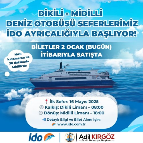 Dikili Belediye Başkanı Adil Kırgöz’ün girişimleri ve İstanbul Deniz Otobüsleri iş birliğiyle Dikili-Midilli seferleri 16 Mayıs 2025 Cuma günü başlıyor.