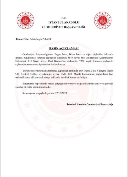 Başsavcılık tarafından yapılan açıklamada "Cumhuriyet Başsavcılığımıza Engin Polat, Dilan Polat ve diğer şüpheliler hakkında ihbarda bulunulması üzerine şüpheliler hakkında 5549 sayılı Suç Gelirlerinin Aklanmasının Önlenmesi, 213 Sayılı Vergi Usul Kanunu’na muhalefet, 7258 sayılı Kanun’a muhalefet suçlarından soruşturma işlemlerine başlanılmıştır. Yürütülen soruşturma kapsamında şüpheliler hakkında Yurt Dışına Çıkış Yasağına ilişkin adli kontrol tedbiri uygulandığı, ayrıca CMK 128. Madde kapsamında şüphelilerin tüm malvarlıklarına el konularak dosya hakkında kısıtlılık kararı verilmiştir. Soruşturma kapsamında maddi gerçeğin her yönüyle açığa çıkarılması amacıyla gereken işlemler titizlikle sürdürülmektedir" ifadelerine yer verildi.