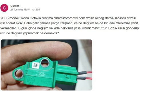"2006 model Skoda Octavia aracıma dinamikotomotiv.com.tr'den airbag darbe sensörü arızası için aparat aldık. Daha gelir gelmez parça çalışmadı ve ne değişim ne de bir iade talebimize yanıt vermediler. 15 gün içinde değişim ve iade hakkımız yasal olarak mevcuttur. Bozuk ürün gönderip üstüne değişim yapmamak ne demektir?"