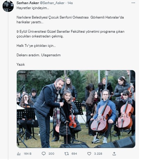 ‘’Hayretler içindeyim.. Narlıdere Belediyesi Çocuk Senfoni Orkestrası Görkemli Hatıralar'da harikalar yarattı. 9 Eylül Üniversitesi Güzel Sanatlar Fakültesi yönetimi programa çıkan çocukları orkestradan çekmiş. Halk Tv'ye çıktıkları için.. Dekanı aradım. Ulaşamadım Yazık. Çocuklar yetenekleriyle, kaliteleriyle, duruşlarıyla bütün ülkeyi sevince boğmuştu. Ve hepsi de velilerininin izniyle oradaydı.. Çocuklarını gururla izlemişlerdi. 2 kez de İzmir Marşı'nı çalmışlardı.. Yayında orkestranın yarısını bu baskı yüzünden tanıtamadım..’’