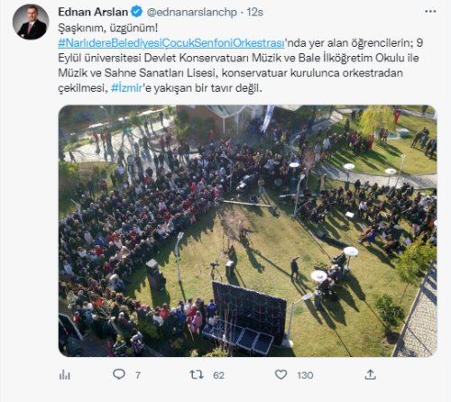 CHP'li Ednan Arslan alınan karara ilişkin sosyal medya hesabından yaptığı açıklamada, "Şaşkınım, üzgünüm! #NarlıdereBelediyesiÇocukSenfoniOrkestrası'nda yer alan öğrencilerin; 9 Eylül üniversitesi Devlet Konservatuarı Müzik ve Bale İlköğretim Okulu ile Müzik ve Sahne Sanatları Lisesi, konservatuar kurulunca orkestradan çekilmesi, #İzmir'e yakışan bir tavır değil. Gençlerimiz #GörkemliHatıralar Programına katıldılar diye bu kararı alanlar; gençlerimizin idealleri ve hayallerinin yanı sıra, örnek alacak ülkemiz gençliğine en büyük kötülüğü yapmaktadırlar. Derhal bu olumsuz tutum ve davranışlarından dönmelerini bekliyoruz’" ifadelerini kullandı.