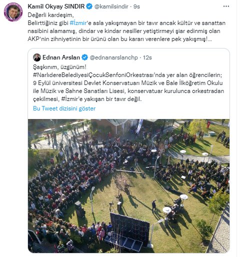 CHP İzmir Milletvekili Kamil Okyay Sındır ise Ednan Arslan'ın tweetini alıntılayarak konuya "Değerli kardeşim, belirttiğiniz gibi #İzmir’e asla yakışmayan bir tavır ancak kültür ve sanattan nasibini alamamış, dindar ve kindar nesiller yetiştirmeyi şiar edinmiş olan AKP’nin zihniyetinin bir ürünü olan bu kararı verenlere pek yakışmış!…" ifadeleri ile tepki gösterdi.