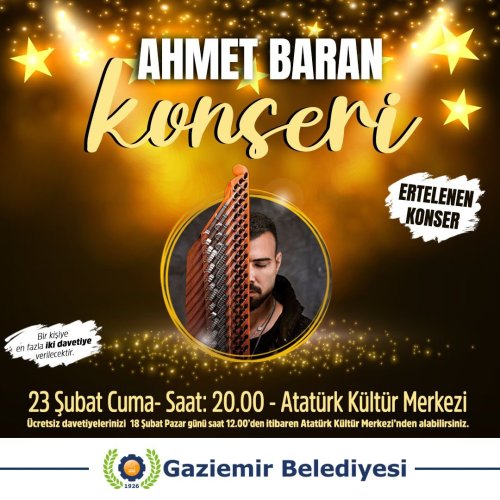 MEDYA EGE - Gaziemir Belediyesi, düzenleyeceği konser ile vatandaşları dünyaca ünlü kanun virtüözü Ahmet Baran ile buluşturacak. Konser verdiği farklı ülkeler ve kültürlerin zenginliğinden ilham alarak üretimlerini gerçekleştiren, kariyeri uluslararası başarılarla dolu Ahmet Baran, 23 Şubat Cuma günü saat 20.00'de Atatürk Kültür Merkezi'nde sahne alarak sevenleriyle buluşacak.
