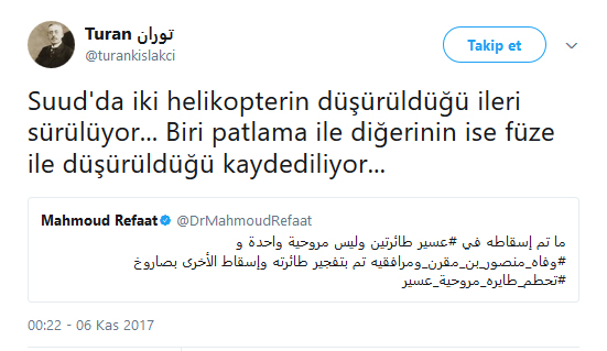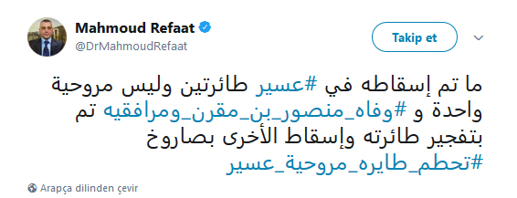Mısır asıllı Avukat-Yazar Mahmoud Refaat'ın iddiasına göre Suudi Arabistan'da iki helikopter düştü. Refaat, düşen helikopterlerden birinin füze ile vurulduğunu diğerinin ise patlama ile düşürüldüğünü kaydetti.
