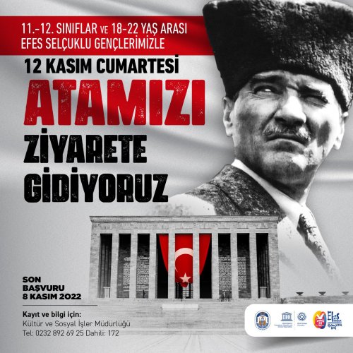 MEDYA EGE - Efes Selçuk Belediyesi, 11-12. sınıflar ile 18-22 yaş arası gençlerle birlikte Anıtkabir'e ziyarete gidecek. Türkiye Cumhuriyeti'nin kurucusunun 84. vefat yıldönümünden iki gün sonra (12 Kasım 2022 Cumartesi) gerçekleşecek olan ziyaret için son başvuru yarın!