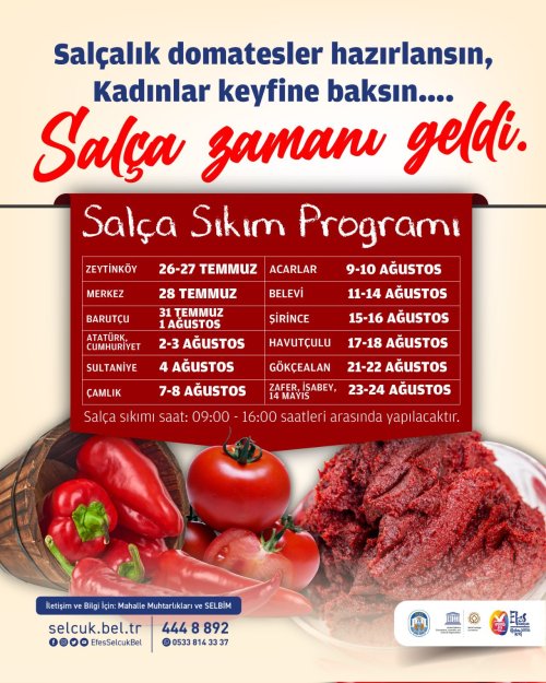 Kış hazırlıkları içinde önemli bir yer tutan salça yapımını kolaylaştıran salça makinası belirtilen tarihlerde (09.00- 16.00 saatleri arasında) köylerde ve merkez mahallelerde olacak.