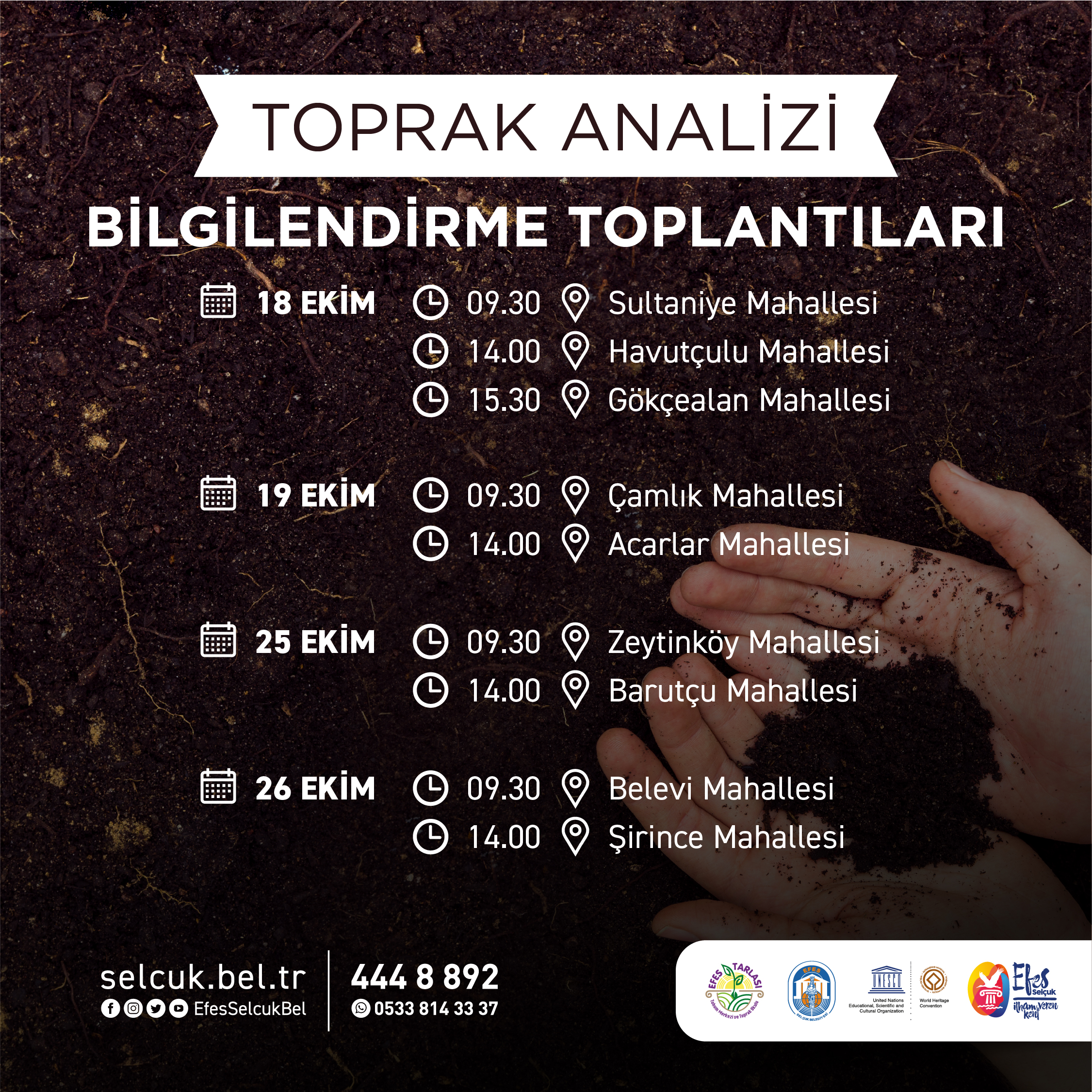 18-19-25-26 Ekim tarihlerinde yapılacak toprak analizi çalışmaları Sultaniye, Havutçulu, Gökçealan, Çamlık, Acarlar, Zeytinköy, Barutçu, Belevi ve Şirince mahallelerinde gerçekleştirilecek.