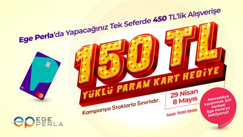 29 Nisan-8 Mayıs tarihleri arasında Ege Perla’dan aynı gün içerisinde yapacağınız, tek seferde 450 TL ve üzeri alışverişlerde 150 TL yüklü Param kart anında hediye!