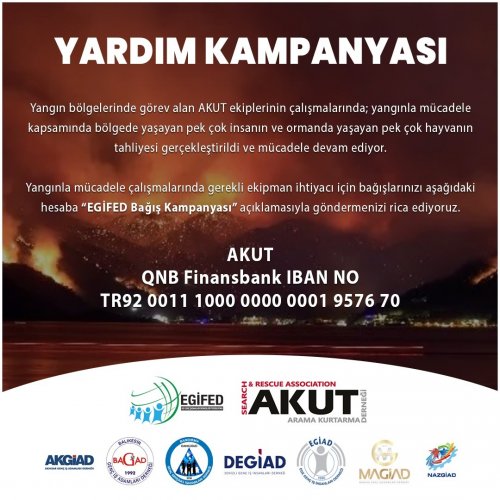 Konuyla ilgili üyelerine çağrıda bulunan EGİFED Yönetim Kurulu Başkanı Aydın Buğra İlter, kampanyaya katılımın büyük önem taşıdığını belirterek, “Operasyonlara katılan ve büyük bir iş birliğiyle çalışan tüm ekipler ve sivil toplum kuruluşları insan üstü bir varlık göstermiştir. Yangın felaketi ile boğuşan tüm il ve ilçe sakinlerimize geçmiş olsun. Vefat edenlerin ailelerine başsağlığı diliyoruz. Son günlerde yaşanan, insan, hayvan, ağaç ve birçok canı kaybettiğimiz yangın felaketlerinde daha büyük kayıplar yaşamamak adına AKUT var gücüyle bölgede faaliyette bulunmuştur. Deprem, yangın, sel tüm felaketlerde her daim yanımızda olan sivil toplum örgütü AKUT’a destek olarak felaket yaşadığımız bölgelere yardımımızı iletmek istedik. Yangınla mücadelede ekipman ihtiyacının karşılanması için AKUT’a destekte bulunacağız” dedi.