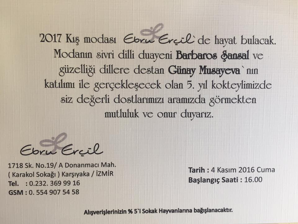 Moda konusunda iddialı isim Ebru Erçil 2017 kış modasına da hayat verecek. Muhalif duruşu ve sivri diliyle Türkiye'nin sevilen isimleri arasında yer alan terzi yamağı lakaplı Barbaros Şansal ve Azeri Güzel Günay Musayeva'nın katılımıyla Karşıyaka Karakol Sokağı'nda bulunan butiğinde 4 Kasım Cuma günü 5. yılını kutlayacak olan olan Ebru Erçil aynı zamanda 5. yıla özel indirim ve sürprizlerle misafirlerini taçlandıracak.