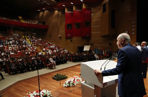 Türkiye'nin kurmaylık dahil askeri eğitimin tüm aşamalarında gerçekten parmakla gösterilen zengin bir müktesebata sahibi olduğunu belirten Cumhurbaşkanı Erdoğan, "Bu güzide çatı altında aldığınız üstün nitelikli eğitimin bundan sonraki meslek hayatınızda sizlere rehberlik edeceğine yürekten inanıyorum. 15 Temmuz hain darbe girişimi sonrasında kurduğumuz Milli Savunma Üniversitemiz kuruluş misyonunu büyük bir başarıyla yerine getiriyor. Gerek astsubay meslek yüksek okulları ve harp okulları gerekse işte bugün burada olduğu gibi harp enstitülerinde eğitim alan evlatlarımız her açıdan en donanımlı en iyi şekilde yetişiyor. Milletimizin köklü değerleri ile birlikte ordumuzun değişen ihtiyaçlarını da karşılayan eğitim sistemi ile üniversitemiz silahlı kuvvetlerimizin farklı kademelerine vazife şuuru yüksek personel kazandırıyor. Milli Savunma Üniversitemizin dünyadaki trendlerin ışığında yeni açılımlarla kendini geliştirmesini memnuniyetle takip ediyoruz. Üniversitemizin Türk Silahlı Kuvvetlerinin kurmay kadrosunu yetiştiren ocak konumu zaten izahtan varestedir. Bu vasfına ilaveten üniversitemizin Türkiye'nin askeri stratejik vizyonunun şekillendirildiği bir merkez olma yolunda ilerlemesi ayrıca takdire şayandır. Şu hakikati hepimiz çok iyi biliyoruz. Düşünce, fikir, vizyon olmadan strateji olmaz. Büyük stratejiler olmadan da taktiksel hamleler arzu edilen neticeyi vermez. Özellikle ülkemizin askeri, diplomatik ve siyasi olarak hemen her gün yeni bir güvenlik sınamasıyla yüzleştiği bir dönemde üniversitemizin bu yönünü güçlendirmesini son derece kıymetli bulduğumuzu ifade etmek isterim. Bütün bunlara ilave olarak üniversitemiz sivil-askeri iş birliği noktasında da çok başarılı bir örnek teşkil ediyor. Üniversitemizin bu özelliğinin korunması ve geliştirilmesi de önemlidir. Bugüne kadar üniversite idaremize gereken her türlü desteği verdik. Eğitim faaliyetleriyle birlikte stratejik, bilimsel ve kültürel sahada attığı vizyoner adımlarla her zaman üniversitemizin yanında olduk. Bundan sonra da sizleri desteklemeyi sürdüreceğiz" dedi.