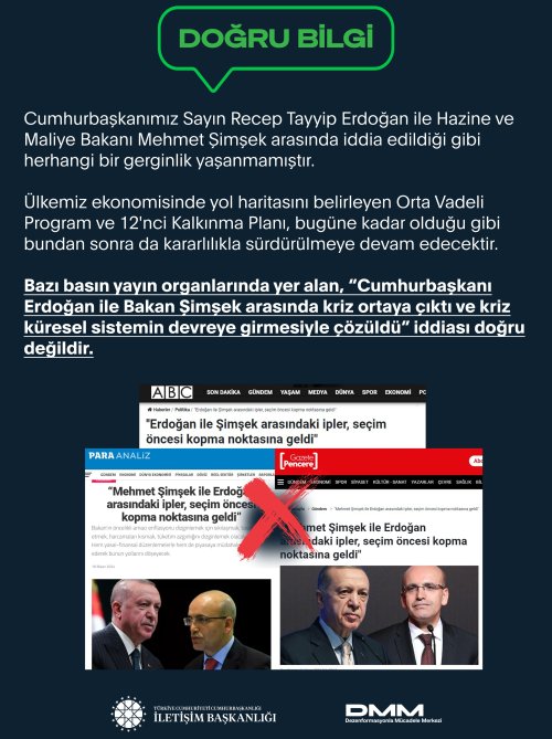 Cumhurbaşkanlığı İletişim Başkanlığı Dezenformasyonla Mücadele Merkezi, bazı basın yayın organlarında yer alan, “Cumhurbaşkanı Erdoğan ile Bakan Şimşek arasında kriz ortaya çıktı ve kriz küresel sistemin devreye girmesiyle çözüldü” iddiasının doğru olmadığını belirtti. Cumhurbaşkanı Recep Tayyip Erdoğan ile Hazine ve Maliye Bakanı Mehmet Şimşek arasında iddia edildiği gibi herhangi bir gerginlik yaşanmadığını Türkiye’nin ekonomisinde yol haritasını belirleyen Orta Vadeli Program ve 12'nci Kalkınma Planı, bugüne kadar olduğu gibi bundan sonra da kararlılıkla sürdürülmeye devam edileceği vurgulandı.