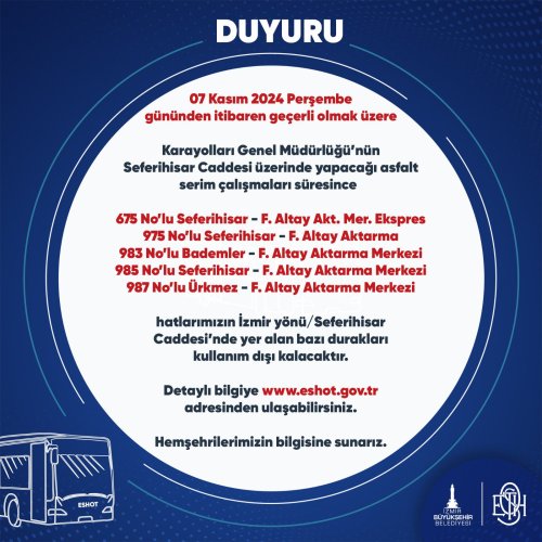 ESHOT Genel Müdürlüğü, Seferihisar Caddesi üzerinde yapılacak asfalt serim çalışmaları sebebiyle, güzergah üzerinde bulunan otobüs hatlarına ait bazı durakların kullanım dışı kalacağını duyurdu.