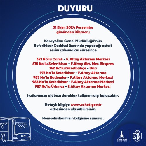 ESHOT Genel Müdürlüğü, Seferihisar Caddesi üzerinde yapılacak asfalt serim çalışmaları sebebiyle, güzergah üzerinde bulunan otobüs hatlarına ait bazı durakların kullanım dışı kalacağını duyurdu.