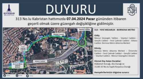ESHOT Genel Müdürlüğü'nün sosyal medya hesabından yapılan açıklamaya göre, 7 Nisan Pazar gününden itibaren 313 No.lu Yeni Mezarlık-Bornova Metro kabristan hattında güzergah değişikliğine gidilecek.