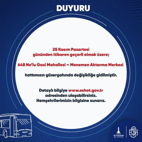 ESHOT tarafından yapılan açıklamada; "25 Kasım Pazartesi gününden itibaren geçerli olmak üzere; 648 No'lu Gazi Mahallesi - Menemen Aktarma Merkezi hattımızın güzergahında değişikliğe gidilmiştir. Detaylı bilgiye www.eshot.gov.tr adresinden ulaşabilirsiniz. Hemşehrilerimizin bilgisine sunarız" denildi.