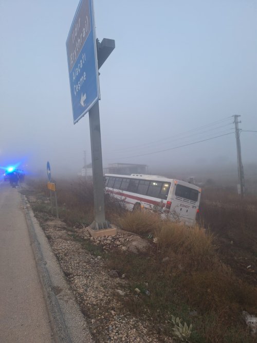 İzmir'in Urla ilçesinden Çeşme istikametine giden ESHOT otobüsü, yoğun sisin de etkisiyle sürücünün kontrolü kaybetmesi sonucu yoldan çıktı. Sürücü ve tek yolcu, kazayı yara almadan atlattı.