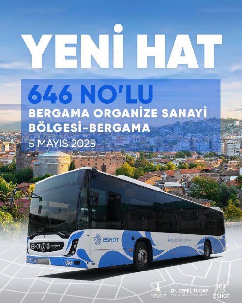 MEDYA EGE - İzmir Büyükşehir Belediyesi ESHOT Genel Müdürlüğü, Bergama’da ulaşımı kolaylaştıracak yeni bir otobüs hattını hizmete aldı. İlçe merkezinden Bergama Organize Sanayi Bölgesi’ne (OSB) ulaşımı sağlayacak 646 numaralı hat, 5 Mayıs Pazartesi günü (bugün) itibariyle seferlerine başladı.