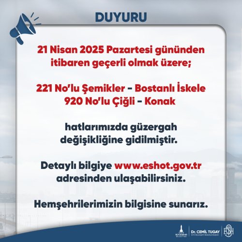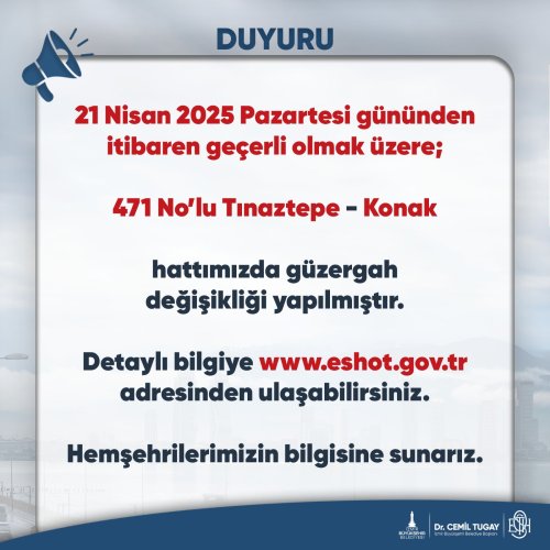 ESHOT'un sosyal medya hesabı üzerinden yapılan açıklamaya göre; 471 No'lu Tınaztepe - Konak hattı üzerinde güzergah değişikliği yapıldı. Ayrıca, 221 No'lu Şemikler - Bostanlı İskele hattı ve 920 No'lu Çiğli - Konak hattında da güzergah değişiklikleri uygulanacağı bildirildi. Söz konusu değişikliklerle ilgili daha fazla bilgi almak isteyen vatandaşların, ESHOT'un resmi web sitesi olan www.eshot.gov.tr adresini ziyaret edebileceği aktarıldı.
